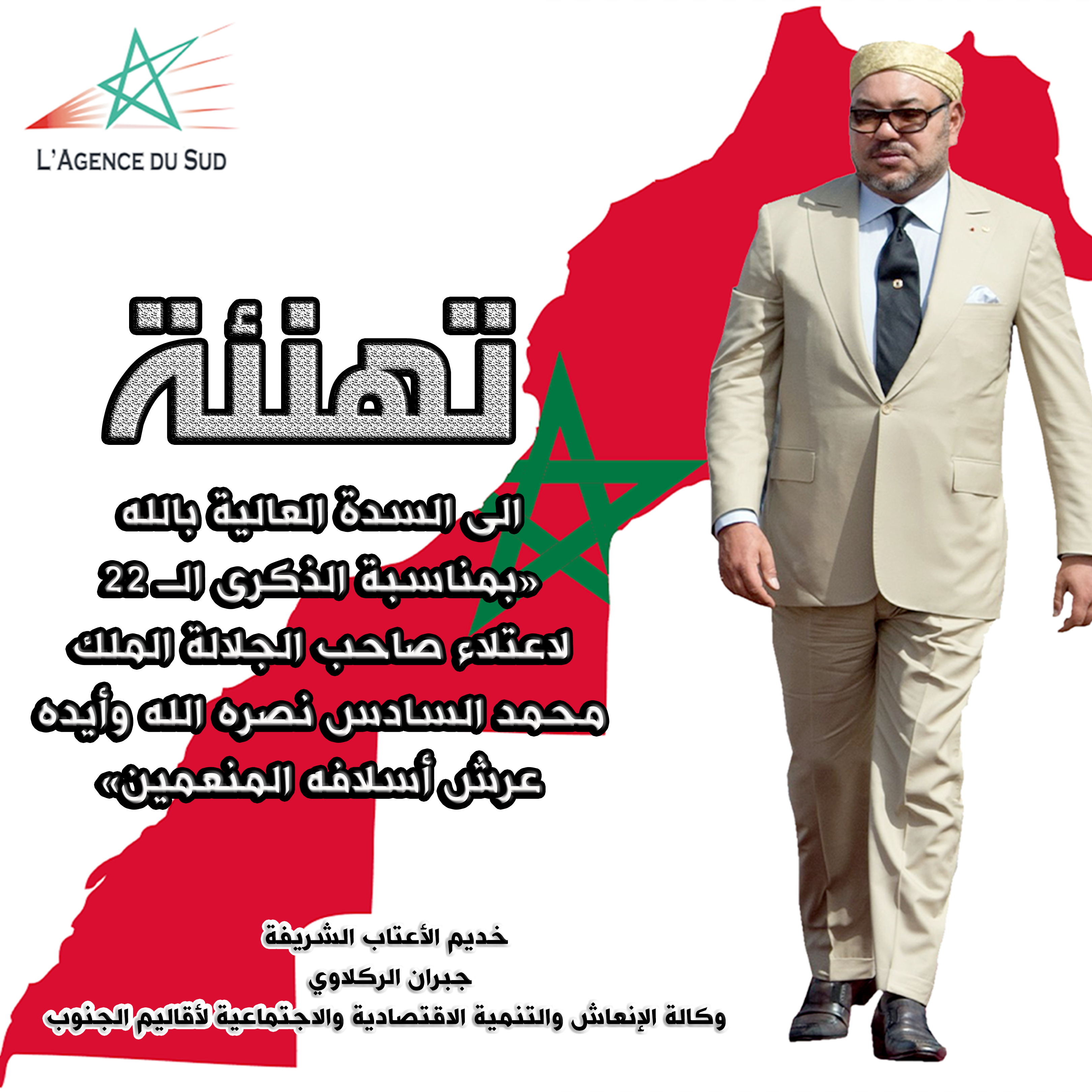 بمناسبة حلول عيد ذكرى عيد العرش المجيد، وفي غمرة الفرحة والبهجة التي يعيشها الشعب المغربي بهذه المناسبة السعيدة قاطبة من طنجة الى الكويرة، يتشرف السيد جبران الركلاوي المدير لوكالة الإنعاش والتنمية الاقتصادية والاجتماعية لأقاليم الجنوب.